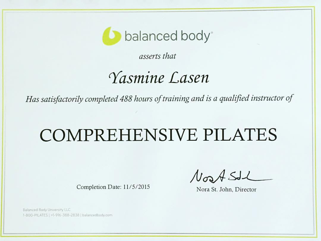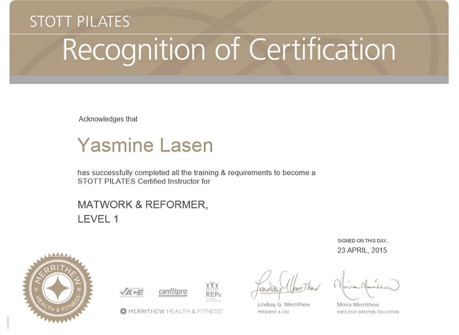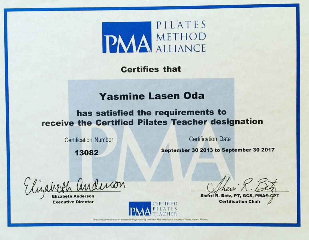Stott Pilates Certified Instructor (Canadá), Balanced Body Certified Instructor (USA), Pilates Method Alliance Certified Instructor (USA).